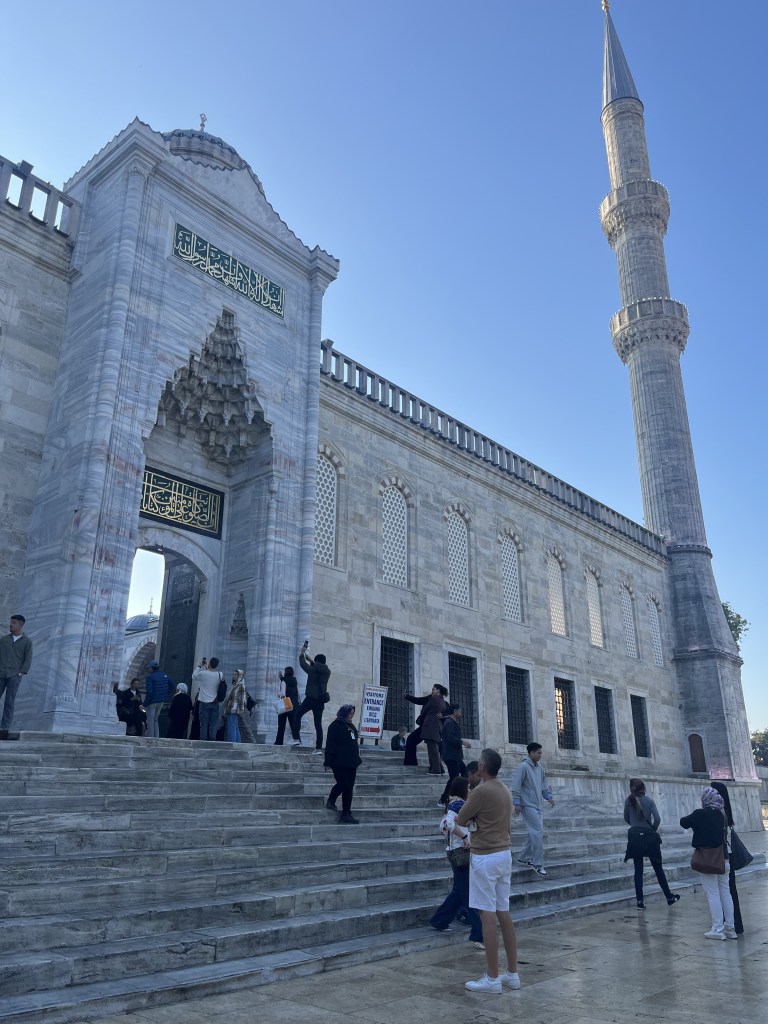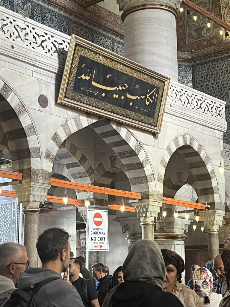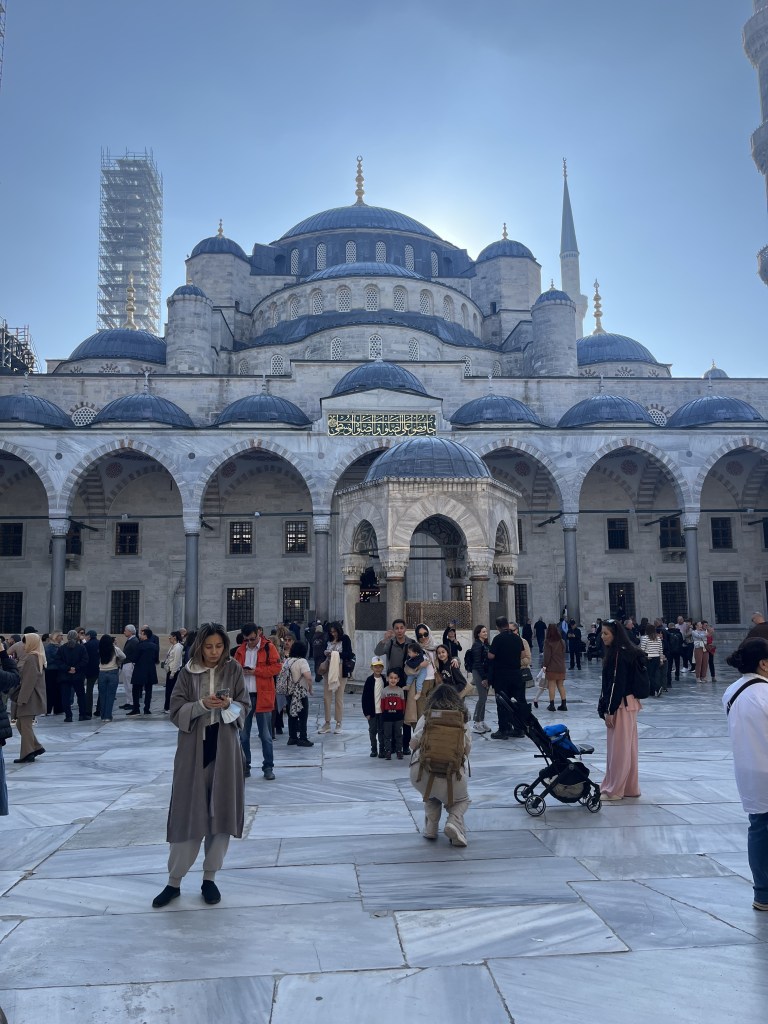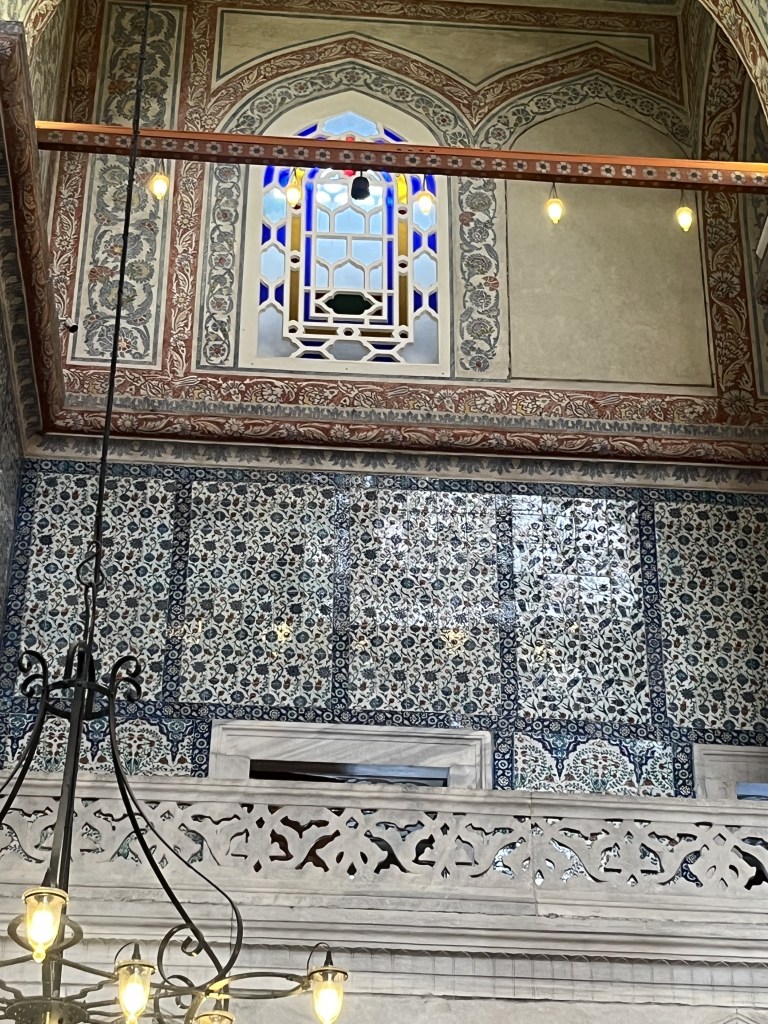 We arrived at the Blue Mosque. It was beautiful, and a little intimidating. The Blue Mosque is a fully functioning place of worship. It hosts daily prayers, major religious events, and state visits and ceremonies for dignitaries. It was commissioned by Sultan Ahmed l, when he was just 19 years old. Construction started in 1609, and was completed in 1616. It was constructed of marble, granite, and over 20,000 handmade Iznik tiles in blue hues. In 1985, the Blue Mosque was included in UNESCO’s Historic Areas of Istanbul as a World Heritage Site. It has undergone a number of renovations, and was reopened for worship on April 21, 2023 after six years of extensive restoration. It holds the tomb of Sultan Ahmed l, who was buried there after his death.