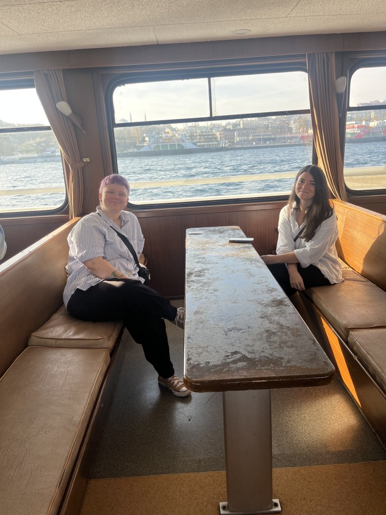 We crossed the bridge to get to the ferry station. We read all the signs, trying to figure out which ferry went to Prince’s Islands. No luck. We asked one of the security guards at one of the stations. He sent us down the pier to the ferry at the other end. That ferry was not going to Prince’s Islands. A guy selling food from a food cart told us we needed to down the stairs and walk across to the other side. We didn’t believe him. After all, he was not in a uniform and he was selling food from a food cart. How much did he really know about the ferries? We asked another person in a uniform sitting behind a window at one of the stations, who pointed to one of the ferries. Nope. Not that one either. We asked a woman, who kind of looked official. She was near what looked like a closed ferry station. She didn’t know where the ferry to Prince’s Islands was. We tried one more man in a uniform. He pointed to the same stairs as the food cart guy. He told us to go down the stairs and cross to the other side. We decided to try it. We finally found it! We could have saved a lot of time if we had not been so judgmental toward the food cart guy. We bought our tickets and gathered with the rest of the group waiting on the ferry. Now, I have an admission to make. I am not necessarily a great person to ride with on a subway or a ferry, or any other type of public transportation. I get nervous that I will get off at the wrong stop. In my defense, this has actually happened to me more than once. I have even been known to pull up google maps when I’m riding in an Uber or taxi. I’m sure the driver appreciates that. I repeatedly check the signs at the stops, check the little map thing over the seats on the subway, intently listen to the people announcing the stops, and pretty much sit on the edge of my seat until I get off on my stop. This does not really make for a relaxing ride, and apparently it really annoys my kids when they go with me. Here are the girls on the ferry, much more relaxed than me and trying not to look annoyed.