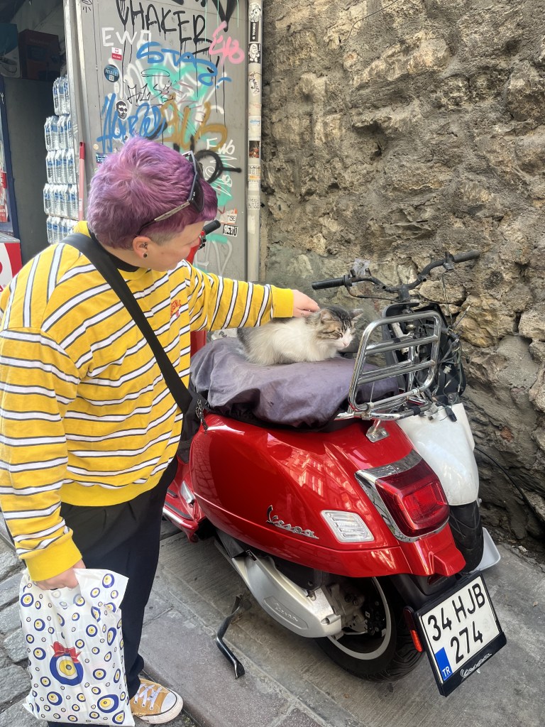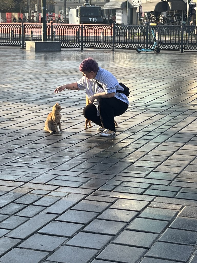 The next day, Ally’s agenda had us headed to Prince’s Islands. We headed down to the Galata Bridge again. Sarah had to stop to pet cats along the way.