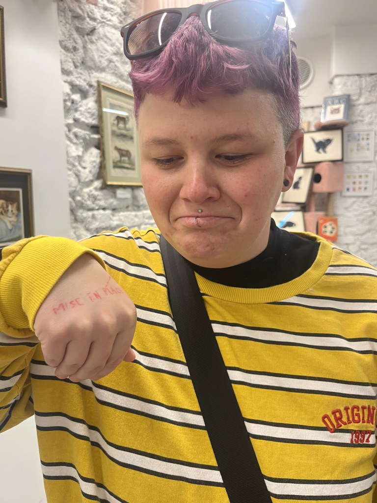 The museum had paintings of cats, statues of cats, t-shirts with cats, and live cats roaming around. Sarah spent most of her time petting the multiple cats in the building. One of the cats did not want to be disturbed, and he let Sarah know how he felt.
