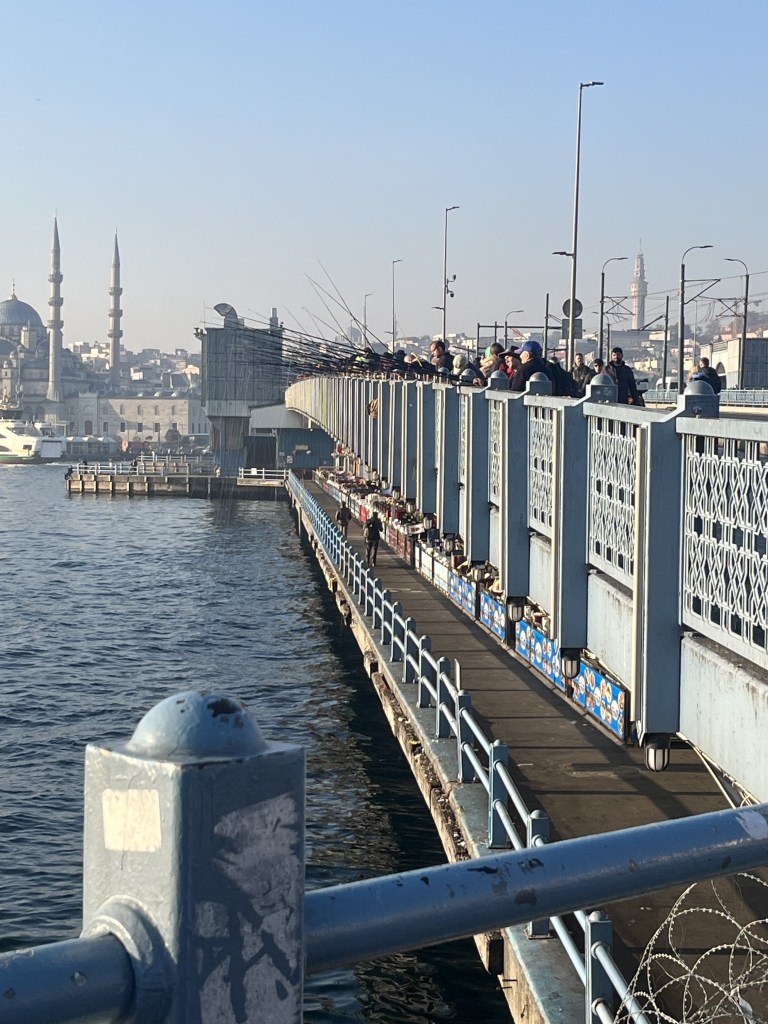 We had to cross the Galata Bridge to get to the area where the mosques were. The Galata Bridge stretches across the Golden Horn harbor between Eminonu and Karakoy, and connects the old and new parts of Istanbul. There were many people walking and standing on the top part of the bridge. People were fishing off the bridge, kids were running around, and people were visiting. Below the bridge were several restaurants, where people could eat and enjoy a view of the water and the city skyline. It seemed like a fun place to be. But we were on a mission.
