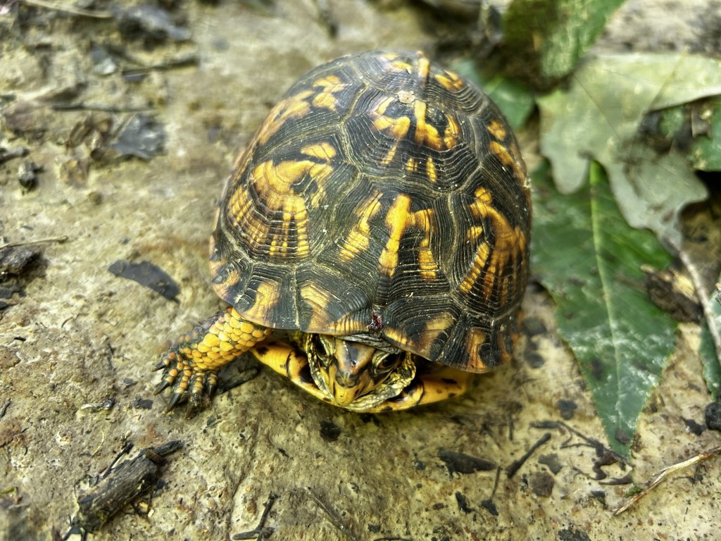 We started out on the trail, and everything seemed fine. It was a beautiful day. This was the year that two broods of cicadas emerged at the same time, so the sound of their buzzing/clicking was very loud. We saw flowers blooming, butterflies flying, and turtles crawling.